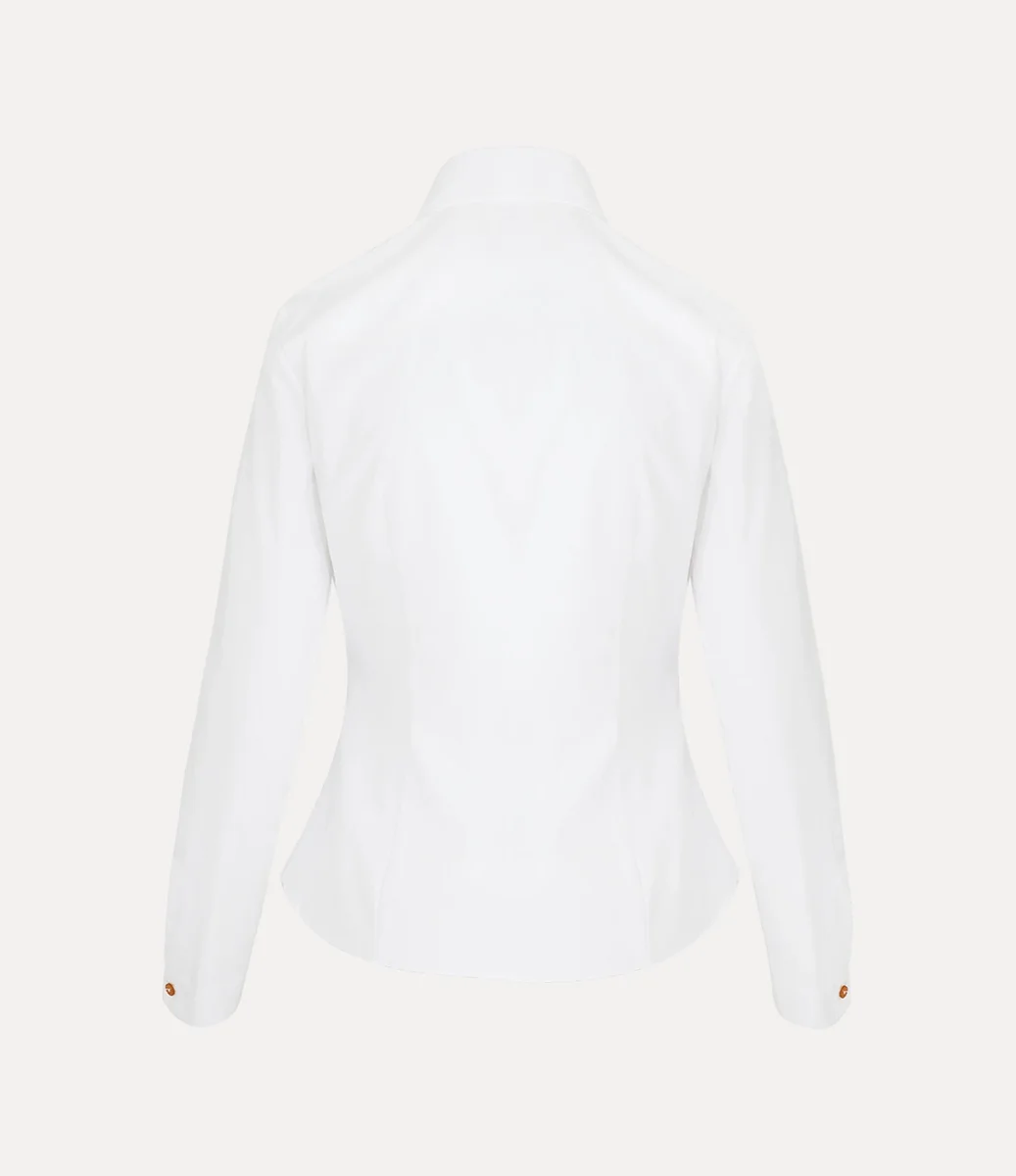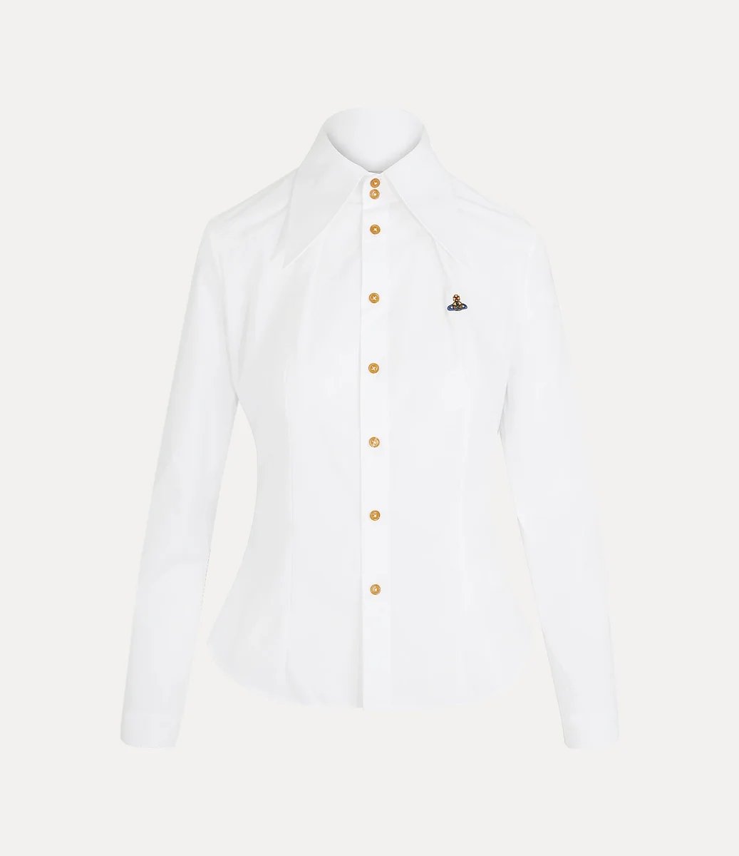 Slim fit W Violin gömleğimiz, sivri uçlu abartılı bir yakaya ve bizim imzası niteliğindeki üç düğmeli kapamaya sahiptir. Bu parça, Vivienne’in geleneği geleceğe taşıma vizyonunun simgesi olan, göğsün sol tarafında canlı renkli ipliklerle işlenmiş bir küre ile süslenmiştir.