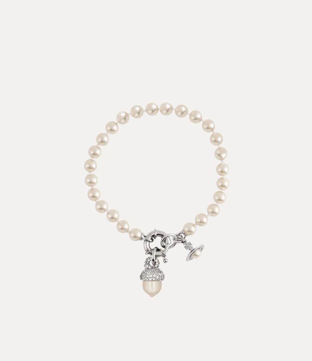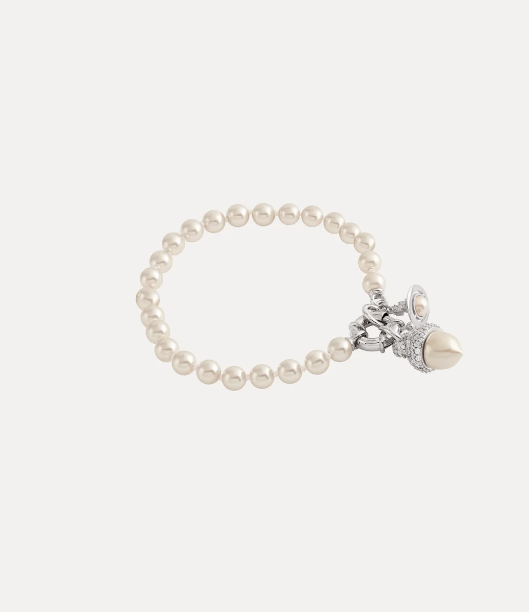 Lucille Pearl bilezik, ihtişam ve lüks hissi uyandıran bir sıra parlak Swarovski cam inciden oluşur. Ortasında, güç ve yeni başlangıçları simgeleyen, pavé kristal süslemelerle bezenmiş reçine bazlı inci meşe palamudu ve narin bir sallanan inci küre charm bulunur.