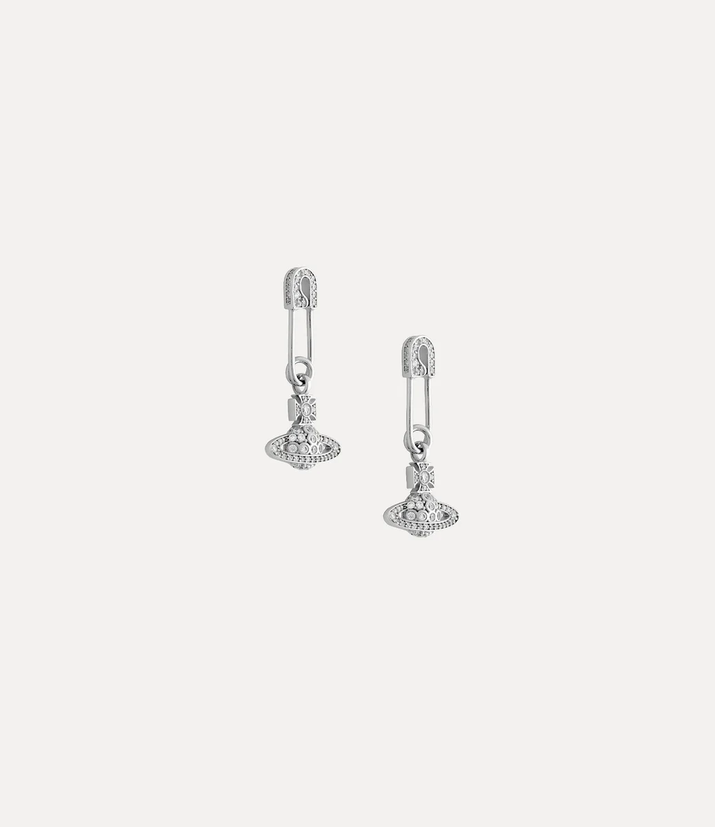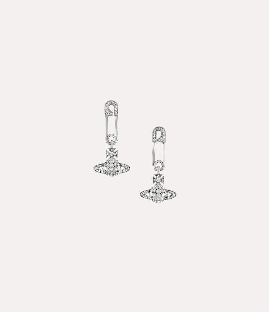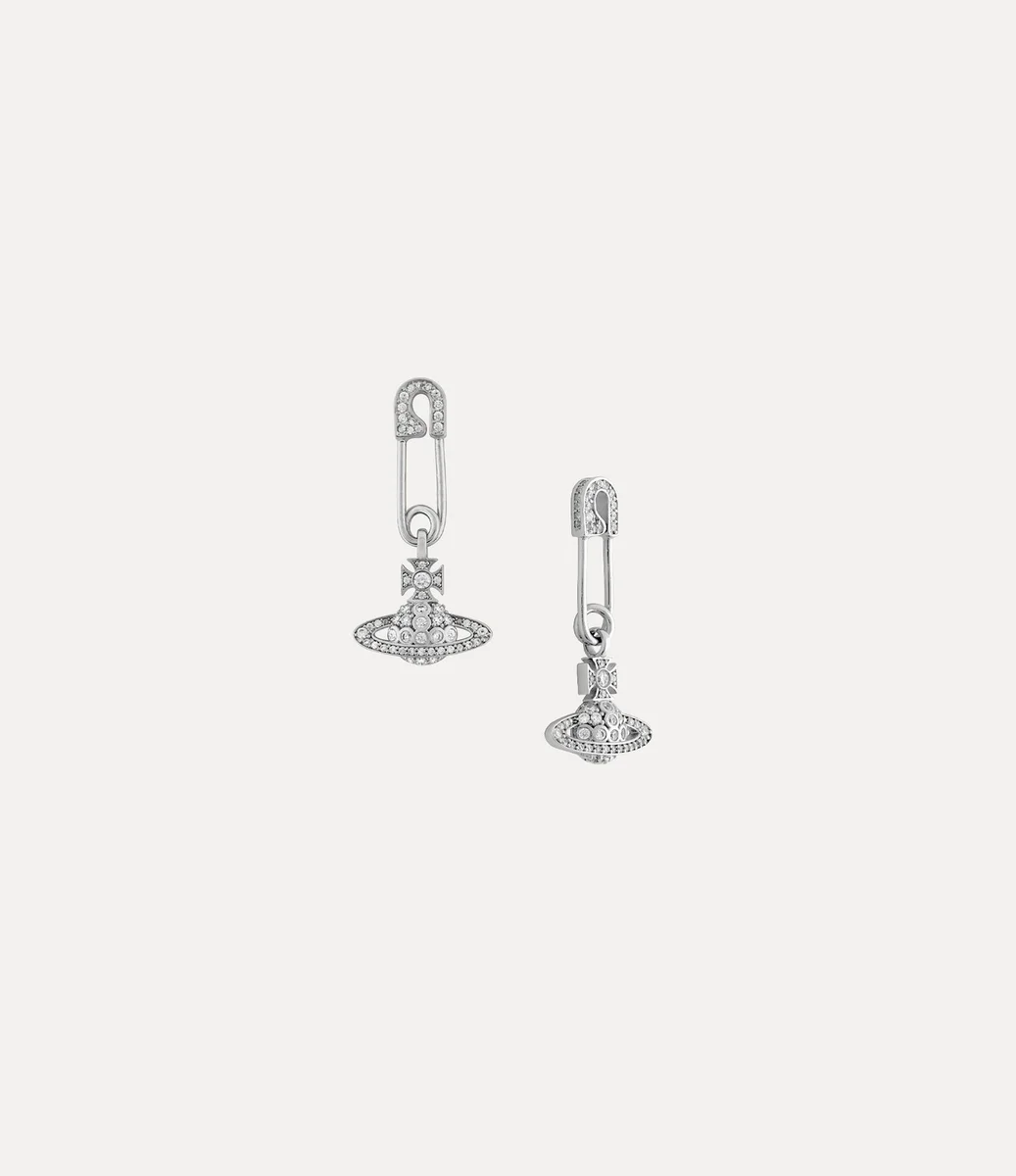 Lucrece küpeler, Vivienne’in asi punk estetiğini anımsatan bir emniyet pimi siluetine sahiptir. Parça, sallanan küre detayıyla damla tasarımına sahiptir ve ışıltılı kristal süslemeler ve cilalı gümüş tonlu kaplama ile tamamlanmıştır.