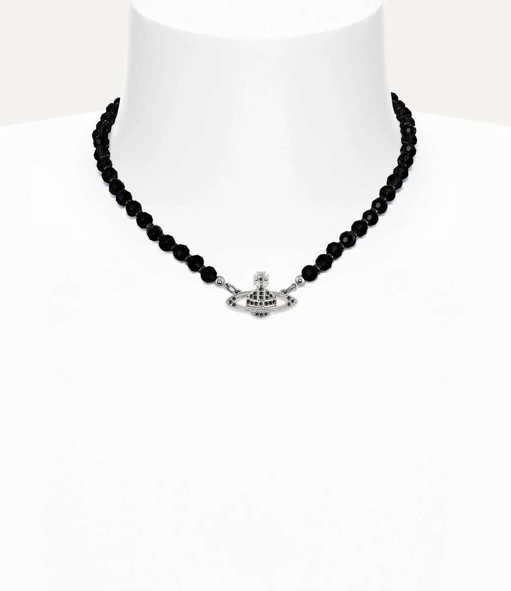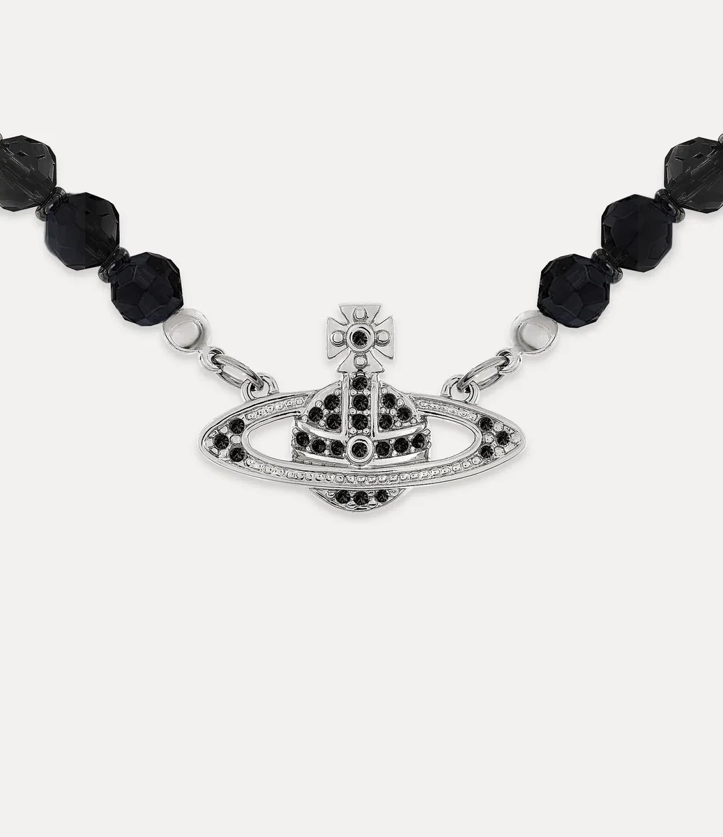 Messaline choker kolyemiz, her biri karmaşık oyma detaylara sahip, el ile düğümlenmiş siyah akik kristallerle yeniden tasarlandı. Cesur tasarımlı bu parça, Vivienne’in geleneği geleceğe taşıma vizyonunu somutlaştıran, jet siyahı kristal süslemeler ve gümüş tonlu kaplama ile süslenmiş imza orb kolye ucumuzu içeriyor.