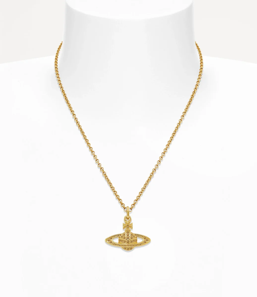 Mini Bas Relief Kolye, altın rengi metal profilli ve ışıltılı tonlu kristal detaylarla tamamlanmıştır. Bu parça, klasik karabina tokalı oyulmuş oval etiketle tamamlanan, bizim imzası niteliğindeki iki boyutlu küre motifini yeniden canlandırmaktadır.