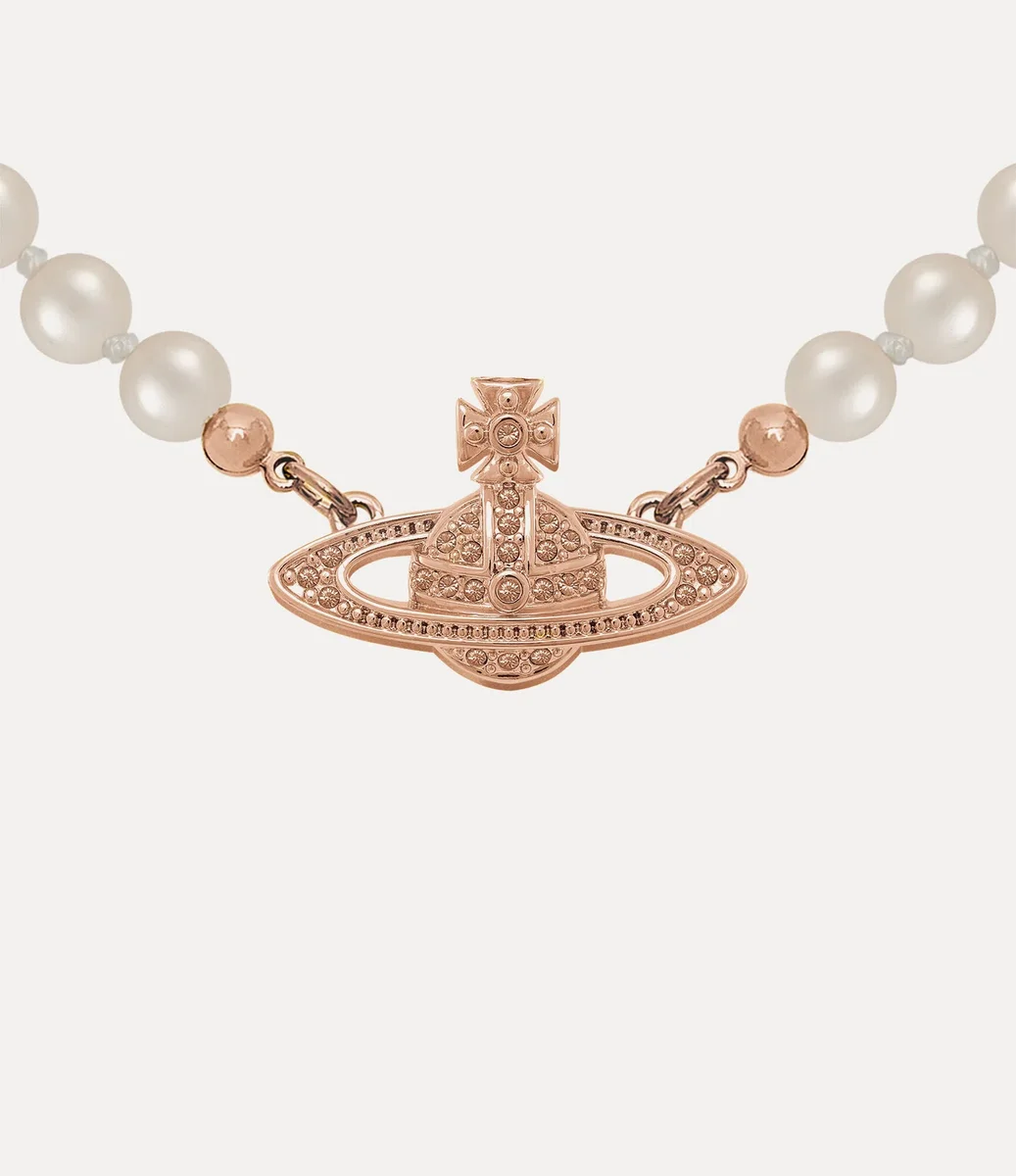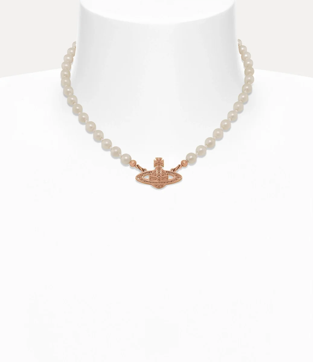 1980’lerin sonunda Vivienne Westwood, Harris Tweed 1987 Sonbahar defilesinde tek sıralı bir choker ile ikonik inci konseptini tanıttı. Mini Bas Relief Pearl choker, bu orijinal tasarımdan ilham alarak, merkezinde klasik küre motifiyle yeniden tasarlanmış ve ışıltılı kristallerle zenginleştirilmiştir. Bu tasarım, markanın geçmişi geleceğe bağlama felsefesini yansıtmaktadır.
