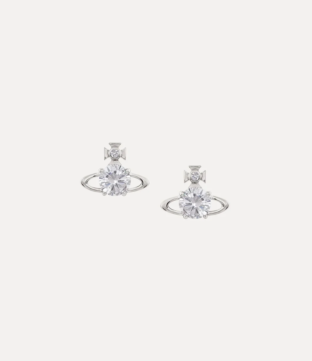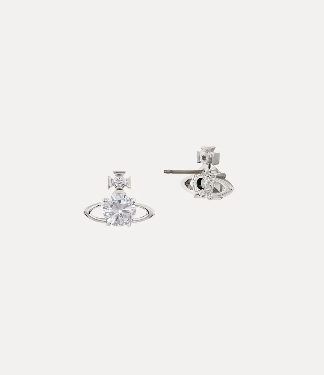 Gümüş tonlu Reina küpeler, Vivienne’in gelenek ile geleceği harmanlama vizyonunu yansıtan küre şeklindeki silüetiyle dikkat çekiyor. Çapraz üst ve ortasında parlak beyaz tonlu kristallerle süslenmiş olan bu zarif tasarım, arkadan takılan bir kapama mekanizmasıyla sabitleniyor.