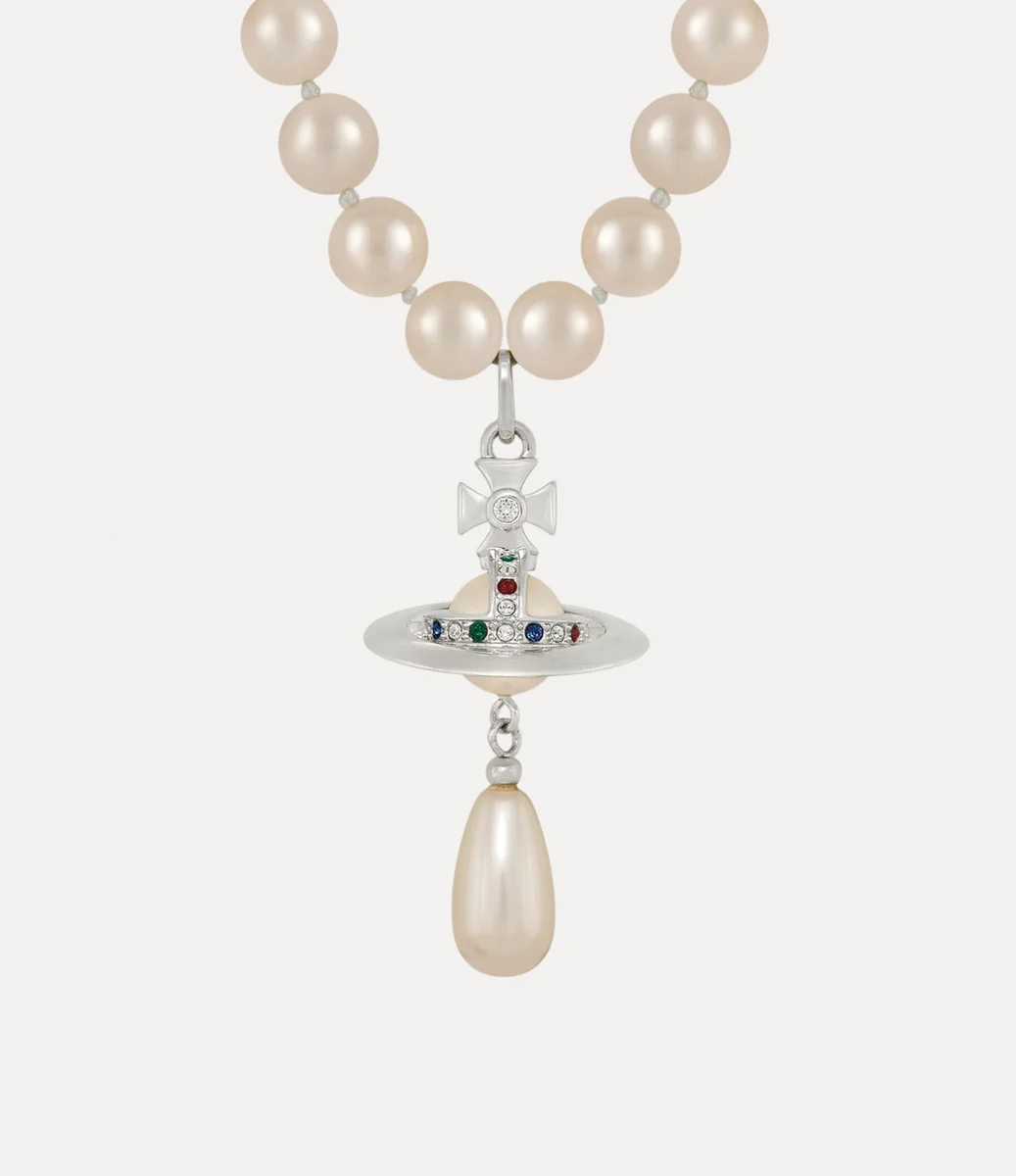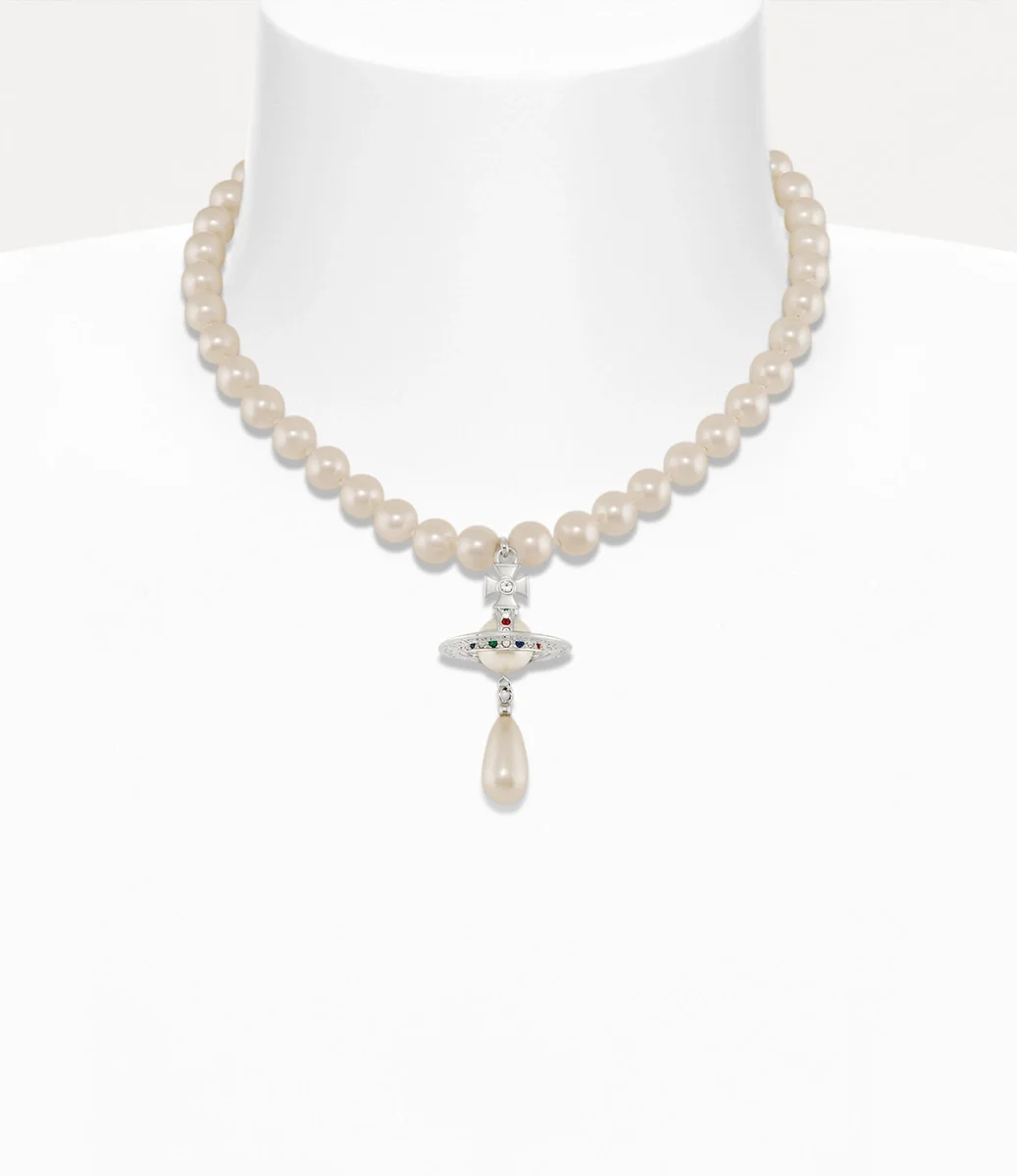 1980’lerin sonunda Vivienne Westwood, Harris Tweed 1987 Sonbahar defilesinde tek sıralı bir choker ile ikonik inci konseptini tanıttı. Tek Sıralı İnci Damla Choker’ımız, kristal detaylarla süslenmiş üç boyutlu küre motifi ve asılı damla şeklinde inci detayı ile orijinal tasarımının zarif formunu yansıtıyor.