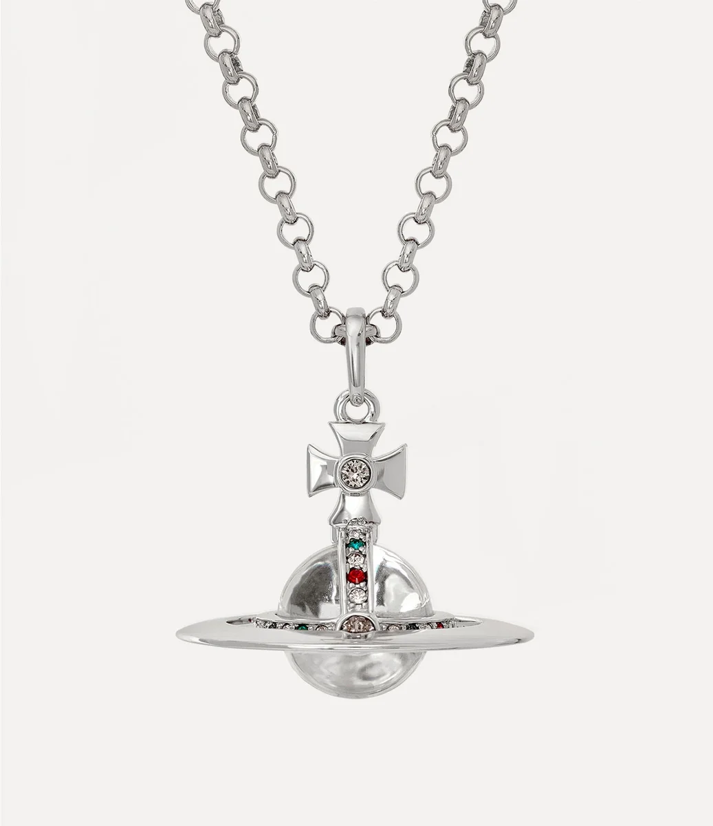 Yeni Küçük Orb Kolye, merkezinde şeffaf bir cam küre bulunan belirgin üç boyutlu orb ile, markanın ikonik orb şeklindeki motifinden ilham alarak Vivienne’in gelenek ile geleceği harmanlama vizyonunu yansıtıyor. Çok renkli kristallerle süslenmiş kolye, tokada kabartmalı bir etiket ile tamamlanıyor.
