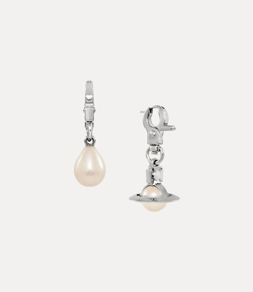 Claude küpelerimiz, gümüş tonlu kaplama ile zenginleştirilmiş asimetrik bir tasarıma sahiptir. Vivienne’in gelenek ile geleceği birleştirme vizyonunu simgeleyen, tamamen metalden yapılmış sallanan küre ile süslenen bu küpeler, kendine özgü döner donanımdan ilham alan bir toka ile asılan klasik inci damla ile daha da güzelleştirilmiştir.