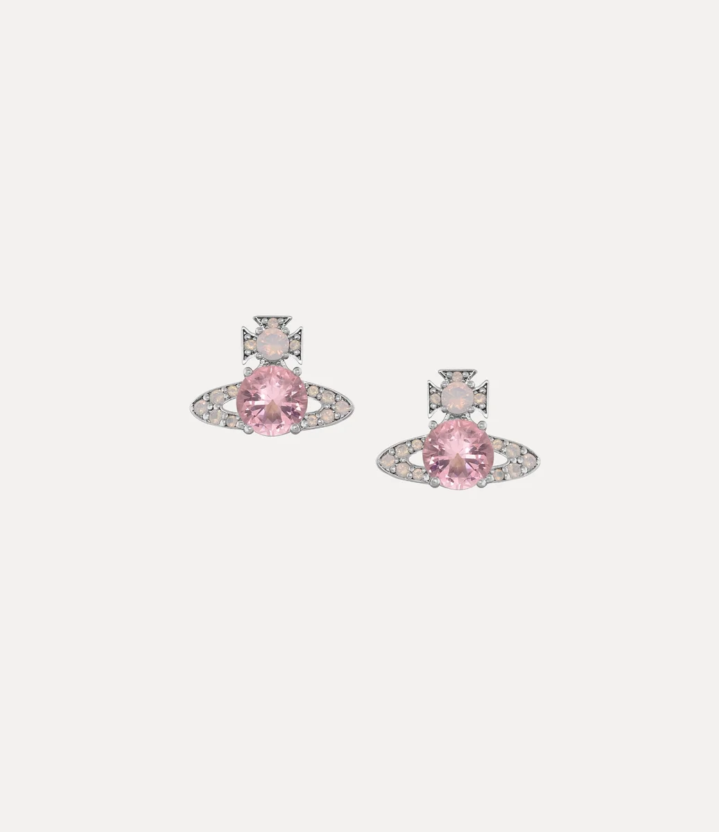 Ismene küpelerimiz, cilalı gümüş tonlu metalden üretilmiş olup, her bir küpenin ortasında büyük, kesimli pembe bir taş bulunmaktadır. Küre tasarımlı Satürn halkası, narin pembe kristallerle süslenmiş olup, üst kısımdaki haç ise süt rengi, yanardöner bir taşla bezenmiştir.