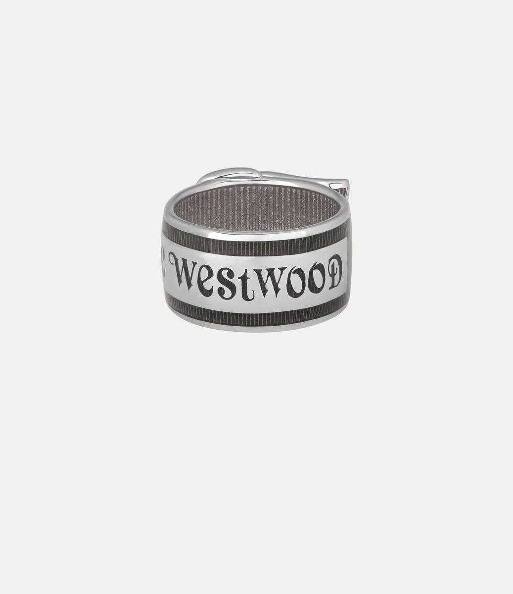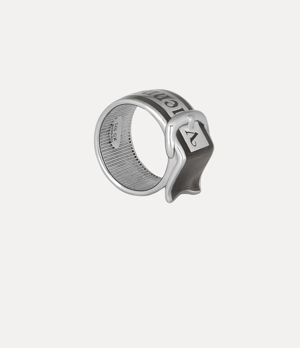 Emaye Kemer Yüzük, platin tonlu kaplama ile markanın arşiv tasarımını yeniden yorumluyor. Yüzük, nervürlü bant ve “Vivienne Westwood” yazısı üzerine elle boyanmış emaye ile süslenmiştir. Heykelimsi bir toka ile tamamlanan bu parça, markanın imza niteliğindeki kemer siluetini yansıtıyor.