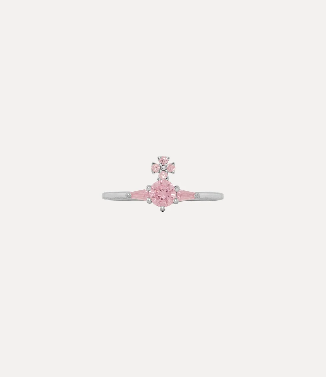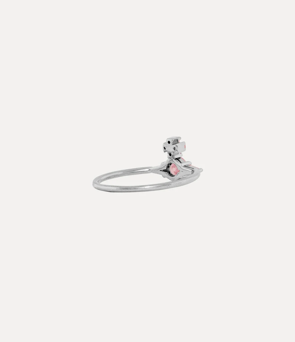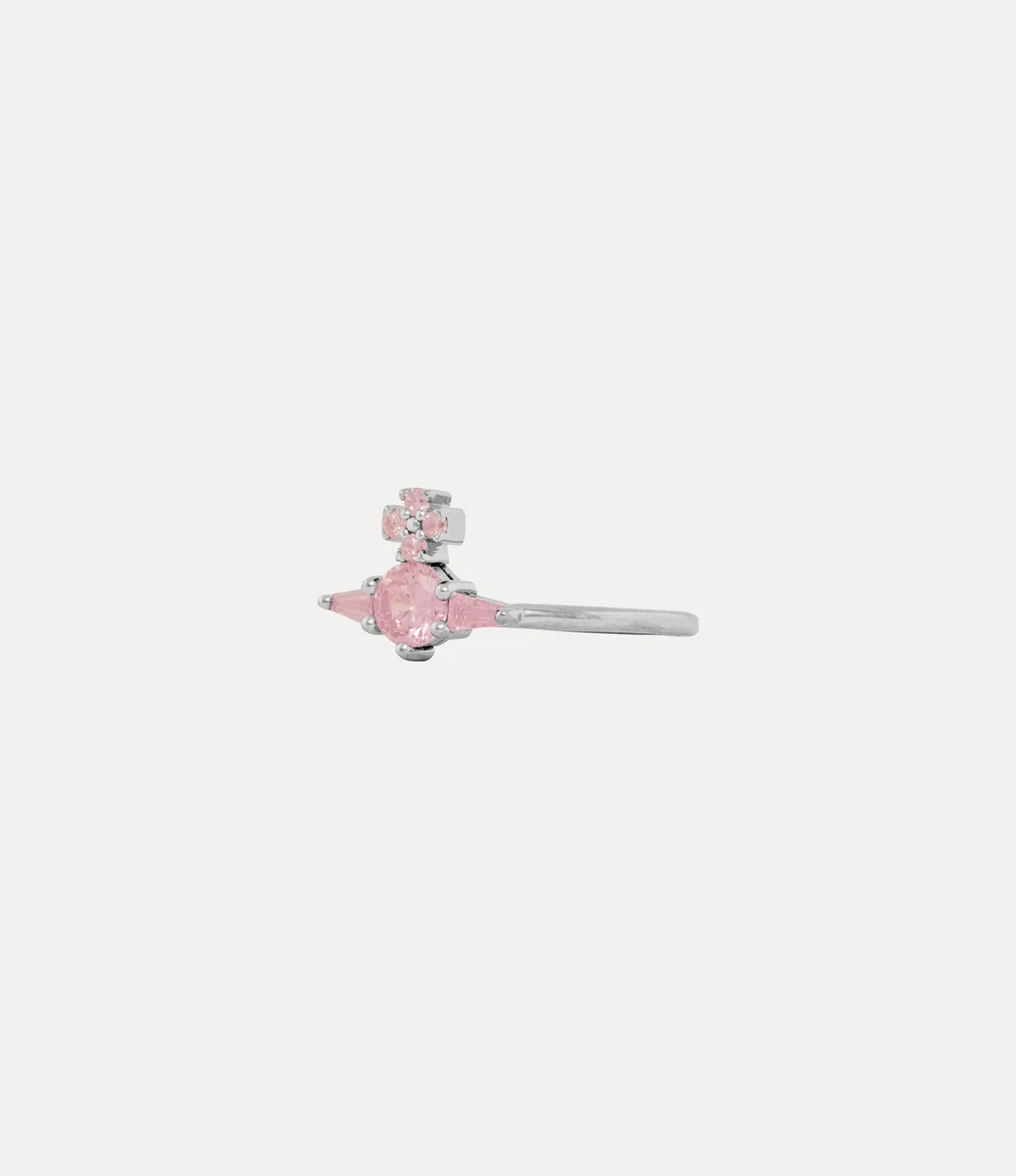 Ofelia yüzüğümüz, platin tonlu gümüşten üretilmiştir ve markanın imza amblemi olan zarif küre motifiyle süslenmiştir. Tasarım, yuvarlak kesim pembe kristal ile süslenmiş, sivrilen baget kristallerle çerçevelenmiş ve çapraz üst kısmında pavé detaylarla tamamlanmıştır. Vivienne’in geleneği geleceğe taşıma vizyonunu yansıtmaktadır.