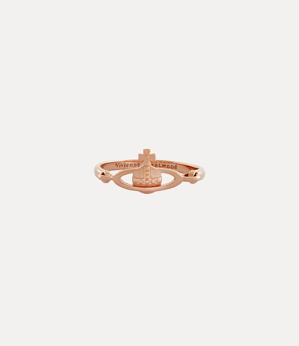 Pembe altın tonlu gümüşten üretilen Vendome yüzüğümüz, hassas bantlı bir tasarıma sahiptir ve yüzünde menteşeler üzerinde dönebilen oyulmuş küre motifi bulunur. Bu motif, Vivienne’in geleneği geleceğe taşımak vizyonunu yansıtmaktadır. Son olarak, parçanın iç tarafında markamızın imza tipografi motifi kazınmıştır.