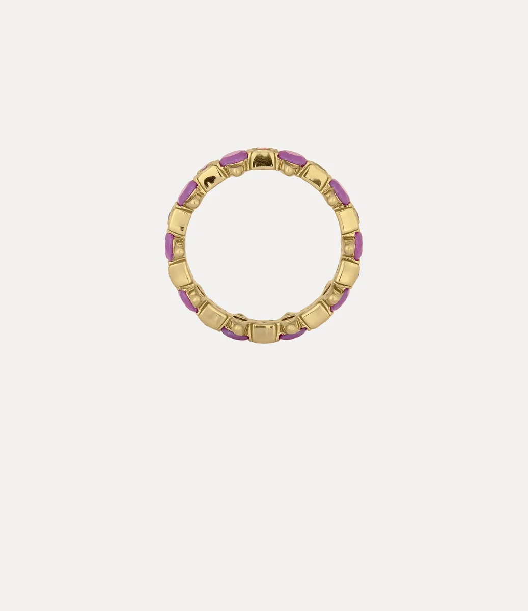 Warwick yüzüğümüz, parlak, altın tonlu kaplamalı, birbirine bağlı küre detaylarından oluşan bir bant ile şık bir geri dönüştürülmüş gümüş tasarım sunar. Parça, her kürenin ortasında mor kristal süslemelerle tasarlanmış ve çapraz üst kısmına yerleştirilmiş küçük değerli taşlarla tamamlanmıştır.p>